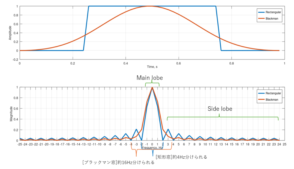まとめると,矩形窓は周波数を鋭く分解するのに適しているが, 窓端の急峻な不連続性によりサイドローブが大きく,本来の信号には含まれない高周波成分がスペクトログラム上に現れやすいという欠点を持つ.一方でブラックマン窓はメインローブが広いため周波数分解能は低下するものの,サイドローブを大幅に抑圧し,スペクトルリークを大きく低減できるという利点がある.このトレードオフ関係を理解した上で,解析目的に応じて両者を適切に使い分ける必要がある.