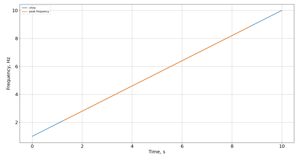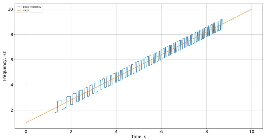 図8 窓幅256のブラックマン窓を用いた場合の振動周波数とチャープ信号の比較