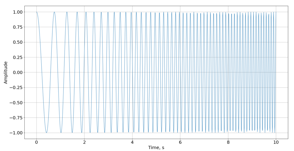 今回, 例として用いる信号は, 時間に伴い周波数が1Hzから10Hzに, 線形に増加するchrip信号である.