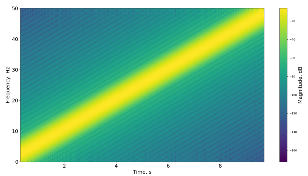 ここでは、チャープ信号を矩形窓を使って短時間フーリエ変換を行う