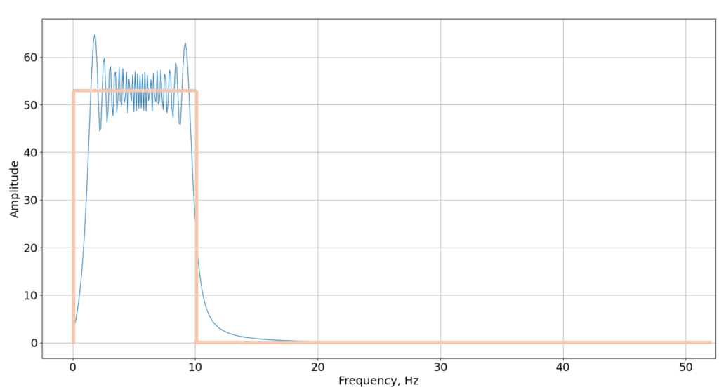 理想的には図3のような矩形状になることであるが, FFTは有限長の信号に対し処理を行うため今回のようにリップルと呼ばれるスペクトルリーケージ(漏れ)が生じる.